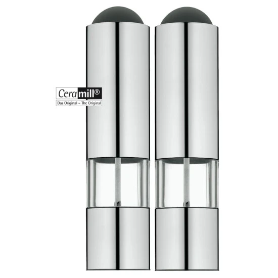 Praktisch, pfiffig und total trendy. Für Salz und Pfeffer aber auch für viele andere Gewürze verwendbar. Leichte Einhandbedienung, stufenlose Einstellung von fein bis grob. Starker Elektromotor für hohen Mahldurchsatz und integrierter Leuchte.