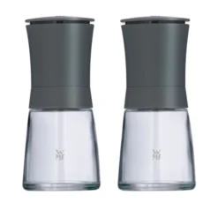 Erst frisch gemahlen beschenken uns Gewürze mit ihrem vollen Aroma, da sich beim Mahlen ihre ätherischen Öle freisetzen. So hat WMF die Ceramill Gewürzmühlen nach dem Vorbild von Pfeffermühlen entwickelt und sie ebenfalls mit einem langlebigen Keramikmahlwerk ausgestattet. Die Mahlstärke lässt sich über ein Einstellrad stufenlos einstellen, um je nach Gewürz die gewünschte Körnung zu erhalten. Gewürzmühlen haben einen Behälter aus Glas, so erkennen Sie auf einen Blick, wie viel Vorrat Sie noch haben. Er ist leicht zu befüllen und in der Spülmaschine zu reinigen. Das Oberteil gibt es wahlweise aus Cromargan®: Edelstahl Rostfrei 18/10, Eichenholz oder hochwertigem Kunststoff. Bei allen Gewürzmühlen sitzt das Mahlwerk oben und hinterlässt keine Mahlspuren auf dem Tisch. Zusätzlich schützt ein Aromadeckel den Mahlkopf und bewahrt gleichzeitig das Gewürzaroma.
