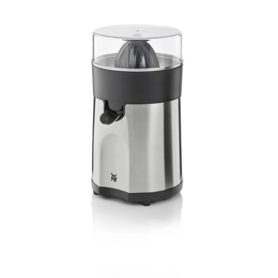 WMF STELIO Zitruspresse. Elektrische Zitruspresse, 2 Presskegel inkl. Saftauslauf direkt ins Glas. Abnehmbarer und spülmaschinengeeigneter Edelstahl-Siebeinsatz und Presskegel. Klarsichtdeckel und rutschfeste Aufstellung. Leistung: 85 Watt.