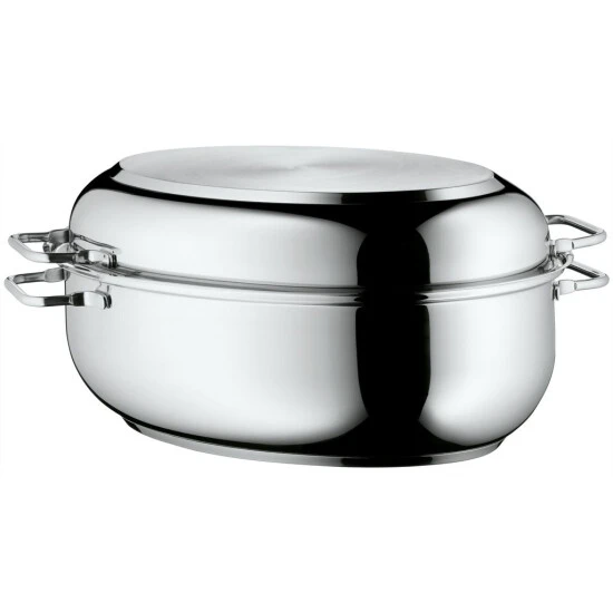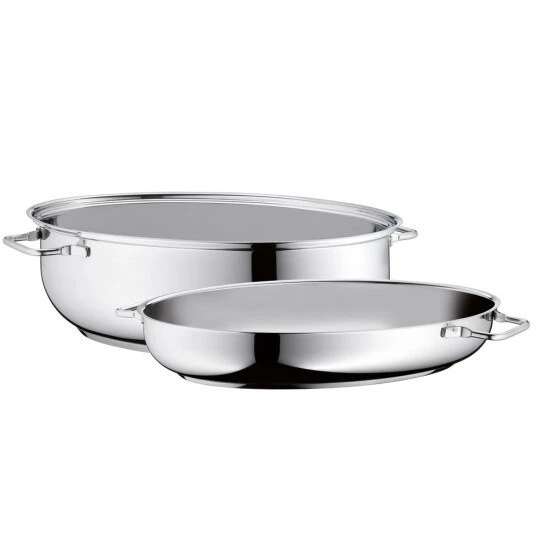 Hochwertiger ovaler Bräter aus Edelstahl. Der Deckel kann auch als Pfanne, Bratreine oder Auflaufform genutzt werden.