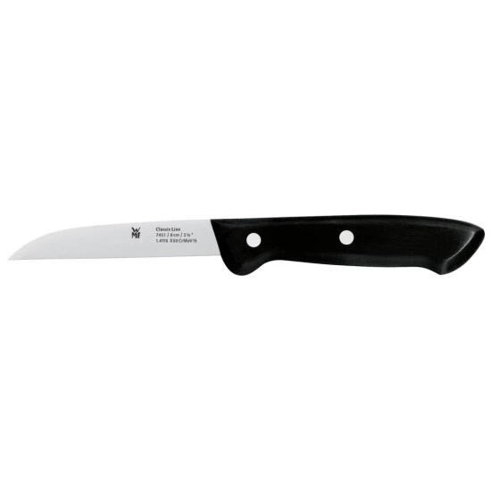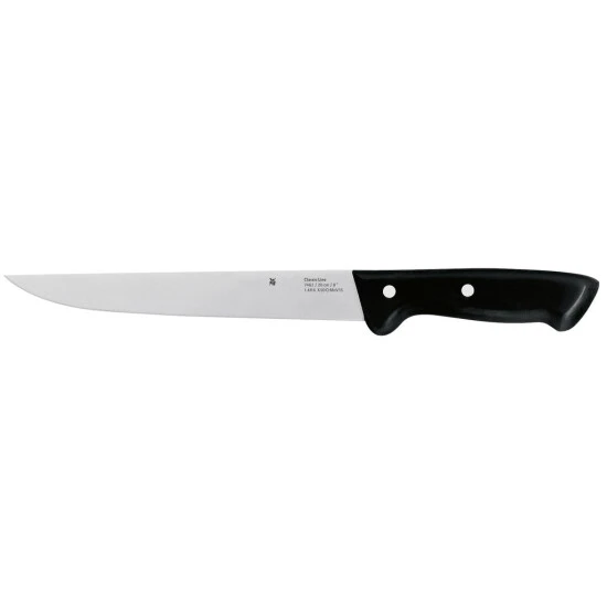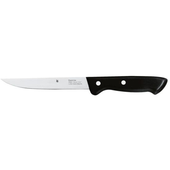Die Classic Line Messerkollektion mit modernem Design ist ideal für alle, die ihr erstes Zuhause ausstatten und einen perfekten Schnitt wünschen. Die Griffe aus hochwertigem Synthetikmaterial, mit Edelstahlnieten, liegen bequem und sicher in der Hand. Sie sind ohne Gelenke ausgelegt und ihre Klingen sind aus Spezialstahl gefertigt. In dieser Kollektion finden Sie das perfekte Messer mit der perfekten Klinge, für alles, was Sie brauchen. Eine Messer-Serie für Einsteiger aus Spezialklingenstahl (Bandstahl) mit vernieteten Griffen aus schwarzem Kunststoff. Die Klinge weist eine hohe und lange Schneidfähigkeit auf. Küchenmesser mit Spezialklingenstahl können jederzeit leicht und wirksam wieder geschärft werden. Ein neuer Schneidwinkel kann mit einem Wetzstab, Wetzstahl, Messerschärfer oder Schleifstein angebracht werden. Die Klingen sollten nach jedem Arbeitsgang unter dem Wasserhahn abgespült werden. Grundsätzlich sind die Messer der Classic Line für die Spülmaschine geeignet. WMF empfiehlt jedoch Handwäsche, um die hochwertigen Klingen vor mechanischer Beschädigung zu schützen.