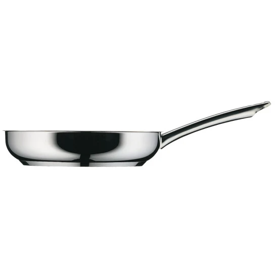 Der Profi fürs Braten. Mit der Bratpfanne Profi von WMF holst du dir ein schickes Multitalent zum Braten in deine Küche. Dank 24 cm Durchmesser finden Pancakes und Spiegeleier, Gemüse sowie Steak in der Pfanne genügend Platz, um perfekt gebraten zu werden. Ihr hoher Rand hält deine Zutaten beim Braten zusammen, sodass beim Wenden und beim Rühren nichts daneben geht. Dank abgerundetem Schüttrand kannst du Saucen und Bratsäfte tropffrei umfüllen. Die Pfanne ist aus glänzend poliertem Cromargan® Edelstahl 18/10 gefertigt. Der speziell von WMF patentierte Edelstahl besticht durch seine robuste Verarbeitung und ist rostfrei, säurebeständig sowie geruchs- und geschmacksneutral. Egal, ob Fisch oder Fleisch – alles schmeckt, wie es soll. Dank TransTherm®-Allherdboden bereitest du deine Zutaten zudem energieschonend zu. Denn er nimmt die Hitze schnell auf, verteilt sie gleichmäßig und speichert sie lange Zeit. Die Pfanne eignet sich für alle Herdarten, inklusive Induktionsherde. Der Stielgriff ist fest mit dem Pfannenkörper verbunden und liegt beim Schwenken der Pfanne sicher in der Hand. Zudem ist er mit einer Aufhänge-Öse versehen, sodass du die Pfanne an einer Küchenleiste aufhängen kannst. Nach Gebrauch kannst du die Pfanne einfach in der Spülmaschine reinigen.