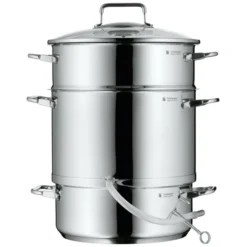 Praktischer Dampfentsafter Edeltstahl für jeden Haushalt für die eigne Zubereitung von Säften, Marmeladen, Fruchtgelees oder Kompott! Frucht- und Gemüsesäfte sind wahre Power Drinks, schmecken lecker, spenden Energie und stärken die Abwehrkräfte. Mit dem WMF Entsafter Dampfentsafter können Sie auf schonende Art aus Früchten oder Gemüse Saft gewinnen. Der WMF Entsafter aus Cromargan® Edelstahl rostfrei 18/10 ist geschmacksneutral, beständig gegen Speisesäuren, hygienisch, pflegeleicht und für die Spülmaschine geeignet. Zudem ist der Entsafter mit einem TransTherm® -Allherdboden ausgestattet und somit für alle Herdarten (auch Induktion) geeignet, hat ergonomische Griffe und einen Güteglasdeckel zum Sichtkochen. Mit dem WMF Entsafter können Sie Früchte ohne Konservierungsstoffe und chemische Zusätze verarbeiten. Beim Entsaften im Dampf werden die Früchte nicht gekocht, sondern nur erhitzt, so bleiben Aroma, Farbe, Geschmack, Mineralien und Vitamine erhalten. Der moderne, platzsparende Entsafter mit ergonomischen Griffen überzeugt durch die verschiedenen Module die auch einzeln verwendet werden können, wie z.B. als Fruchtkorb und Kochtopf mit Deckel.