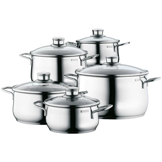 1. Wahl, Cromargan® Edelstahl Rostfrei 18/10 poliert, spÃ1/4lmaschinenfest, hitzebeständiger Glasdeckel bestehend aus: – 1x Bratentopf 16cm – 1x Bratentopf 20cm – 1x Fleischtopf 16cm – 1x Fleischtopf 20cm – 1x Fleischtopf 24cm Das 5-teilige Kochtopf-Set besteht aus 5 unterschiedlichen Kochtöpfen in verschiedenen AusfÃ1/4hrungen, Höhen und Durchmessern. Das einheitliche Design wirkt ansprechend in der KÃ1/4che. Die Zusammenstellung bietet vielseitige Möglichkeiten beim Kochen. WMF Kochtöpfe sind aus bestem Cromargan® Edelstahl Rostfrei 18/10 – strapazierfähig, unempfindlich gegen Kratzer und Stöße und auch bei intensivem Gebrauch unverwÃ1/4stlich. Die Diadem Plus Kochtopf-Serie darf ohne Deckel unbegrenzt in den Backofen gegeben werden. Mit Deckel bis maximal 180°Grad. Aktions-Set Lieferung solange Vorrat reicht! Â Â