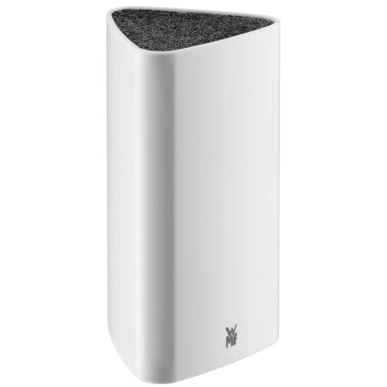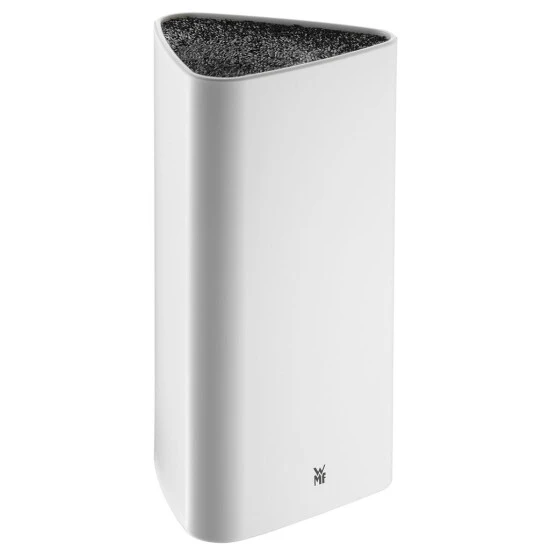 Für noch mehr Freude beim Kochen! Der bestückte Messerblock Elements Joy von WMF macht gute Laune – denn er überzeugt in Qualität und Design gleichermaßen. Der Messerblock aus hochwertigem chromfarbenem Kunststoff wird dank seiner Triangel-Form zu einem attraktiven Blickfang auf Ihrer Arbeitsplatte. Im Inneren ist er von vielen feinen schwarzen Kunststofffäden durchzogen, die eine flexible und elastische Aufnahmefläche für die Messer bilden. Dementsprechend können die Messer unterschiedlich und individuell im Messerblock positioniert werden. Die Messer fallen dank der heiteren Farben ihrer Griffe sofort ins Auge. Die farbigen Griffe haben auch eine praktische Bewandnis: Jedes der 3 Messer hat eine eigene Farbe, sodass die Wahl immer auf das richtige Messer fällt, auch wenn die Klinge im Block verborgen ist. Der Messerblock ist mit 1 Kochmesser (Klingenlänge: 13 cm; Farbe: vanilla white), 1 Zubereitungsmesser (Klingenlänge; 15 cm; Wellenschliff; Farbe: stone grey) und 1 Allzweckmesser (Klingenlänge: 9,5 cm; Farbe: plum red) ausgestattet. Alle Klingen bestehen aus Spezialklingenstahl und werden in der hauseigenen Klingenschmiede der WMF über ihre gesamte Länge geschmiedet. So behalten sie lang anhaltend ihre Schärfe und sind besonders flexibel. Das Material bleibt außerdem absolut rostfrei und ist beständig gegen Säureangriffe. Alle Klingen sind doppelseitig geschliffen. Griff und Klinge sind bei allen Messern perfekt ausbalanciert, wodurch die Schneidarbeit zusätzlich erleichtert wird.