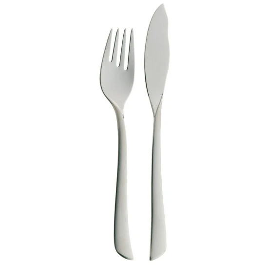 Das Fischbesteck ist ausschließlich für Fischfilets oder ganze Fische zu verwenden. Das Fischmesser hat keine geschliffene Klinge und ist daher nur zum Zerteilen, oder Schieben des Fisches gedacht. Die Messerklinge ist symmetrisch geformt und setzt sich nach unten hin vom Messerheft ab. Die Fischgabel hat als Merkmal einen Einschnitt von den Zinken in das Gabelschiff, wird aber dennoch normal verwendet und ist fast identisch wie dieVorspeise-/ Dessertgabel. Zu jeder WMF Besteck-Kollektion gibt es das passende Fischbesteck.