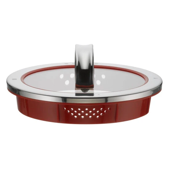 - Glasdeckel mit Silikonrand mit vier Abgießfunktionen. Je nach Positionierung können Sie Flüssigkeit abgießen, große Löcher halten Nudeln zurück, kleine Reis und in geschlossener Position können Sie wasserarm garen