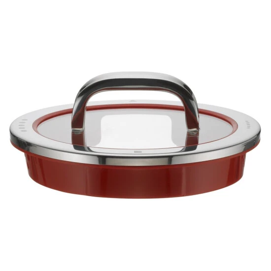 Das Kochgeschirr entstand zusammen mit dem Designbüro NOA Aachen, für die Topfdeckel stand der MP3-Player iPod von Apple Pate. Gefertigt aus Edelstahl und Silikon, besitzt der Deckel vier verschiedene Funktionen angelehnt an das Bedienrad vom iPod. Praktisch, denn je nach Position lassen sich Flu?ssigkeiten mit geschlossenem Deckel ganz oder kontrolliert abgießen: Durch die großen Sieböffnungen entweicht das Kochwasser, die Nudeln bleiben im Topf. Dasselbe funktioniert mit den kleinen Sieböffnungen für Reis. Die geschlossene Position ist für wasserarmes Garen gedacht und die offene, um Flüssigkeiten voll abzugießen. Der rote Ring im Deckel ist ein echter Hingucker. Aus hitzebesta?ndigem Silikon gefertigt, sitzt er immer fest im Topf. Die Wärmeübertragung der Hitze wird durch die speziellen Hohlgriffe verringert, daher bleiben sie länger kühl. Bei langen Kochzeiten oder beim Gebrauch im Ofen, sind zum Öffnen des Deckels und Tragen des Topfes Topflappen oder Ofenhandschuhe notwendig. Die To?pfe besitzen eine Innenskalierung zum leichten Dosieren von Flüssigkeiten und bestehen aus unverwüstlichem Cromargan. Der TransTherm Allherdboden ist auch fu?r Induktion geeignet, er gibt die Hitze vom Herd schnell und direkt weiter und speichert lange Wärme. Zur Serie gehören verschiedene Töpfe, von der Bratpfanne über den Dämpfereinsatz bis zur Stielkasserolle.