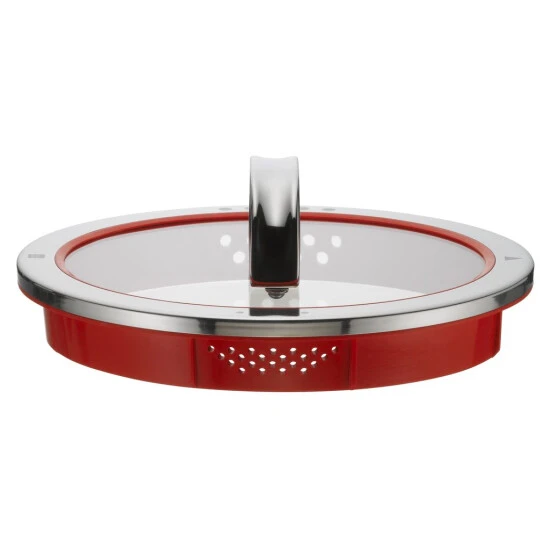 - Glasdeckel mit Silikonrand mit vier Abgießfunktionen. Je nach Positionierung können Sie Flüssigkeit abgießen, große Löcher halten Nudeln zurück, kleine Reis und in geschlossener Position können Sie wasserarm garen