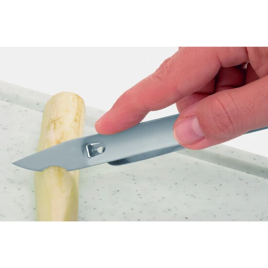 Die Klingenspitze des Spargelschälers eignet sich optimal um Spargelenden abzuschneiden. Mit der beweglichen Klinge wird der Spargel knapp und gleichmäßig geschält. Geeignet für Rechts- und Linkshänder.