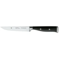Eine Prise Nostalgie gepaart mit modernster Materialverarbeitung das sind die Komponenten der WMF Grand Class Messer-Serie. So erinnern die schwarzen Griffe mit Edelstahlnieten optisch an traditionelle Handwerkskunst längst vergangener Zeiten. Die moderne, fugenlose Verarbeitung der hochwertigen Kunststoffgriffe sorgt für ein hohes Maß an Hygiene und ihre ergonomische Form für angenehme und sichere Handhabung. Der Kropf dient als Fingerschutz beim Schneiden. Wie alle WMF Messer bestehen auch die der Grand Class Edition aus hochwertigem Spezialklingenstahl, der über die gesamte Länge geschmiedet wurde. Der Performance Cut verleiht den Klingen schließlich ihre außergewöhnliche und langlebige Schärfe. Zur Kollektion gehören Koch- und Fleischmesser mit verschiedenen Klingenlängen, Allzweck-, Gemüse-, Brot- und Küchenmesser, Santoku-, Spick-, Steak-, Zubereitungs- und Tourniermesser.