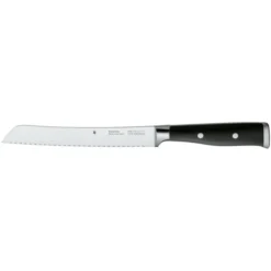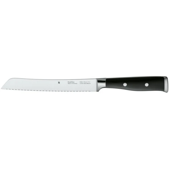 Das Grand Class Brotmesser von WMF hat ein sehr traditionelles Design in moderner Jacke. Der Kunststoff Handgriff ist mit geschmiedeten Nägeln nahtlis und robust befestigt, und sorgt so für einen optimalen Griff während des Schneidens.