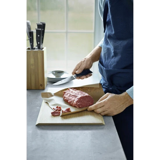 Eine Prise Nostalgie gepaart mit modernster Materialverarbeitung das sind die Komponenten der WMF Grand Class Messer-Serie. So erinnern die schwarzen Griffe mit Edelstahlnieten optisch an traditionelle Handwerkskunst längst vergangener Zeiten. Die moderne, fugenlose Verarbeitung der hochwertigen Kunststoffgriffe sorgt für ein hohes Maß an Hygiene und ihre ergonomische Form für angenehme und sichere Handhabung. Der Kropf dient als Fingerschutz beim Schneiden. Wie alle WMF Messer bestehen auch die der Grand Class Edition aus hochwertigem Spezialklingenstahl, der über die gesamte Länge geschmiedet wurde. Der Performance Cut verleiht den Klingen schließlich ihre außergewöhnliche und langlebige Schärfe. Zur Kollektion gehören Koch- und Fleischmesser mit verschiedenen Klingenlängen, Allzweck-, Gemüse-, Brot- und Küchenmesser, Santoku-, Spick-, Steak-, Zubereitungs- und Tourniermesser.
