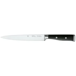 Das Fleischmesser eignet sich hervorragend zum Schneiden und Tranchieren von rohem oder gebratenem Fleisch. Das Fleischmesser hat eine große Klinge, welche dafür sorgt, dass man einen festen und sauberen Schnitt der Fleischfasern hat, damit beim Tranchieren keine wertvollen Bratensäfte auslaufen. Da Fleisch ganz unterschiedlich portioniert wird, kann man mit dem Fleischmesser auch kleinere Mengen schneiden. Es kann also auch zum filigranen Würfeln oder in Streifen schneiden des Fleischs verwendet werden. Ein Fleischmesser gehört in jede Messer Grundausstattung, deshalb ist es auch in den WMF Messer-Sets enthalten.
