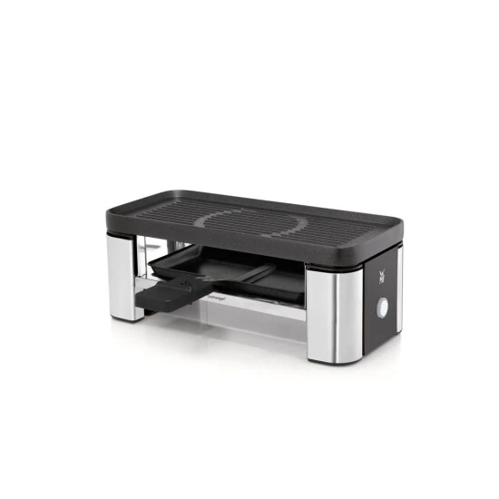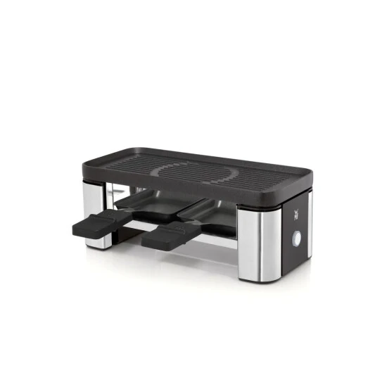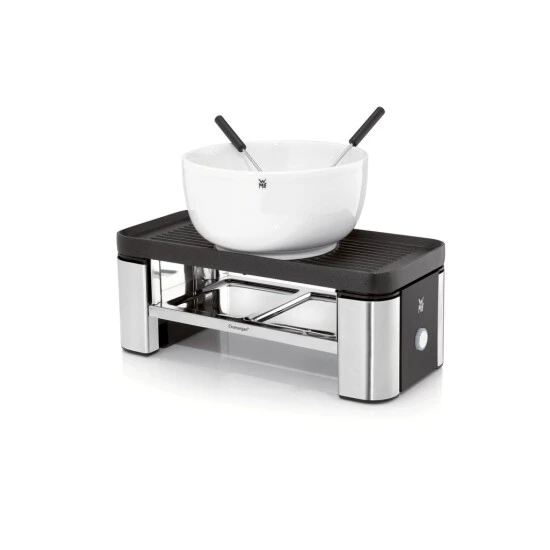 WMF Küchenminis Raclette für zwei. Raclette für 2, flache & gerippte Wendegrillplatte, inkl. Schokofondue mit Keramikschale und zwei Cromargan® Spießen. Leistung: 370 Watt.