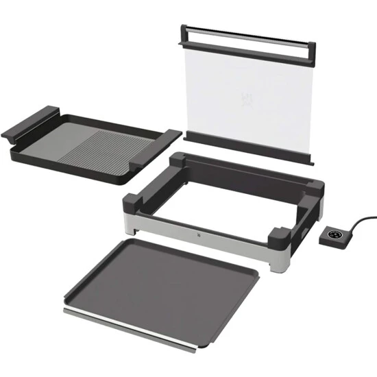 - Grillvergnügen Indoor! Mit dem WMF Lono Tischgrill mit wärmeisoliertem Gehäuse aus mattiertem hochwertigem Cromargan® und Glasdeckel lässt sich bedenkenlos in Innenräumen brutzeln, braten und grillen. Dank 2.200 Watt Leistung gelingen Fleisch, Fisch, Gemüse und Co. wie gewohnt geschmackvoll und aromatisch. Für noch mehr Sicherheit sorgt die integrierte, große und leicht zu entnehmende Fettauffangschale mit einem Sicherheitsschalter, der das Grillen nur bei eingesetzter Schale erlaubt. Das mühelose Zerlegen des Grills ermöglicht eine kinderleichte hygienische Reinigung der einzelnen Teile. Und das pflegeleichte Cromargan®-Gehäuse darf sogar in die Spülmaschine.