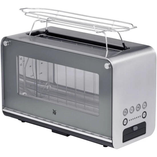 Mit dem WMF Lono Glas-Toaster erobert eine Besonderheit den Frühstückstisch. Einfach Toast oder Brotscheibe einlegen, Knöpfchen drücken und dann geschieht alles von ganz alleine. Wie mit dem Aufzug fährt die Aufnahme automatisch – und dank integrierter Brotzentrierung in die perfekte Position für gleichmäßige Bräunungsergebnisse. Und das alles direkt vor den Augen des Betrachters, denn das herausnehmbare Glasfenster bietet faszinierende Einsichten während des gesamten Vorgangs. 7 variabel einstellbare Bräunungsgrade, beleuchtete Funktionstasten (Bagel-, Aufwärm-/ Nachtoast-, Auftau- und StoppFunktion), ein separater Brötchenaufsatz und eine herausnehmbare Krümelschublade runden das Frühstückserlebnis auf komfortable Art und Weise ab.