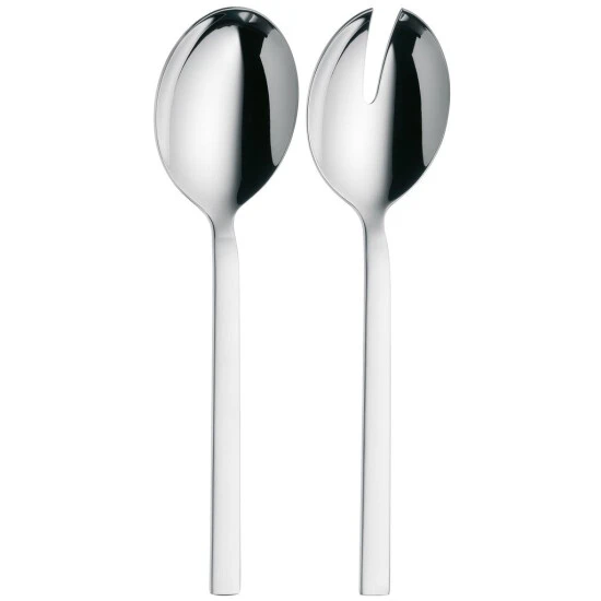 Durchmischen, aufgreifen, servieren: Keine Frage, zu einem frischen Salat gehört ein Salatbesteck. Es ist stets zweiteilig, wobei seine flachen, äußerst großzügig gestalteten Laffen die leichte Aufnahme des Salats ermöglichen – und zwar so, dass überschüssiges Dressing vor dem Servieren leicht abtropfen kann. Die langen Stiele des Bestecks sorgen für bequemes Hantieren und verhindern zugleich, dass es in die Salatschlüssel rutscht.