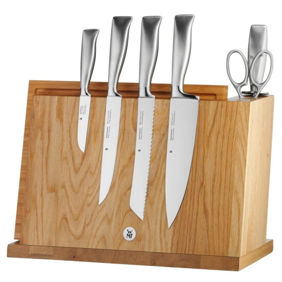 Clever verstaut. Der Magnetmesserblock Eiche von WMF ist nicht nur eine praktische und schonende Aufbewahrungsmöglichkeit für deine Messer, sondern bringt das passende Schneidebrett gleich mit. Der Messerblock aus robustem Eichenholz misst 39 x 17,5 cm. Er bietet Platz für 4-5 Messer (je nach Klingenform und –länge), 1 Schere und 1 Wetzstahl. Du brauchst die Messer lediglich senkrecht an die schräge Ablagefläche lehnen: Der integrierte Magnetstreifen hält sie sicher an ihrem Platz. So sind die Klingen keiner Reibung ausgesetzt und bleiben länger scharf. Schere und Wetzstahl kannst du in separaten Aussparungen schnell und einfach verstauen. Im Set inkludiert ist ein praktisches Schneidebrett aus Bambus. Das Brett (33,5 x 23 cm) ist mit einer umlaufenden Saftrille versehen, sodass beim Schneiden der austretende Saft nicht auf die Küchenzeile kleckert. Wenn du es nicht brauchst, kannst du das Schneidebrett einfach hinter dem Messerblock verstauen. Nach Gebrauch solltest du das Brett per Hand reinigen. Bei Bedarf lässt sich der Messerblock mit einem feuchten Tuch säubern.