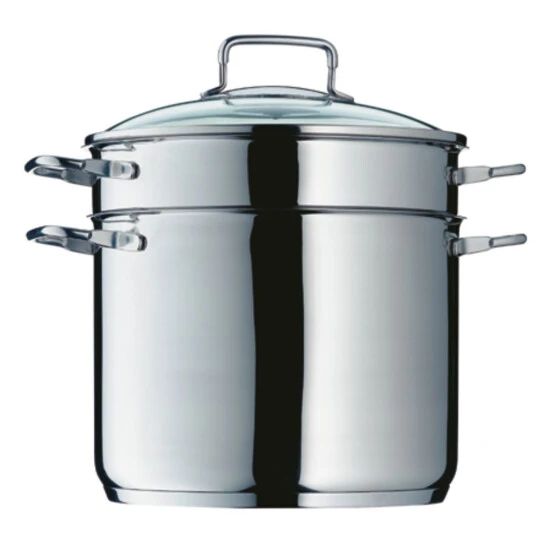 Unverzichtbar für Liebhaber italienischer Pastaklassiker – mit dem Nudeltopf aus dem Hause WMF kochen Sie Ihre Nudeln auf die raffinierte Art und Weise. Das Prinzip des Nudeltopfs ist simpel. Der Topf besteht aus zwei Teilen: einem unteren Topf und einem Einsatz, der am Boden über einen Standring und eine durchgehende Perforierung verfügt. Die Nudeln werden in diesem Einsatz gekocht. Durch den Hohlraum zwischen dem unteren Topf und dem Einsatz hat das Kochwasser ausreichend Platz, um sich auszubreiten, sodass es am Topfrand nicht überläuft. Ein Deckel dient zusätzlich als Aromaschutz. Die Kombination aus klarem Güteglas und rostfreiem Cromargan® Edelstahl 18/10 macht ihn besonders robust und hitzebeständig. Dank des Griffs lässt sich der Deckel ohne Verbrennungsgefahr abnehmen. Mit einem Durchmesser von 24 cm schafft der Topf Platz für insgesamt 7 Liter. Die Innenskalierung im Einsatz erleichtert dazu die Dosierung. Topf und Einsatz sind beide aus poliertem, rostfreiem Cromargan® Edelstahl gefertigt. Dadurch sind sie nicht nur äußerst widerstandsfähig, sondern sehen zudem elegant aus. Der untere Topf verfügt außerdem über einen raffinierten TransTherm®-Allherdboden. Der speziell von der WMF entwickelte Boden ist vielfältig einsetzbar und für alle Herdarten geeignet, auch für Induktion. Für den täglichen Einsatz sind alle Komponenten des Nudeltopfes für die mühelose Reinigung in der Spülmaschine geeignet.
