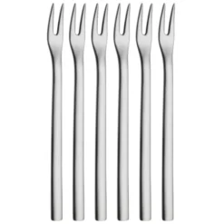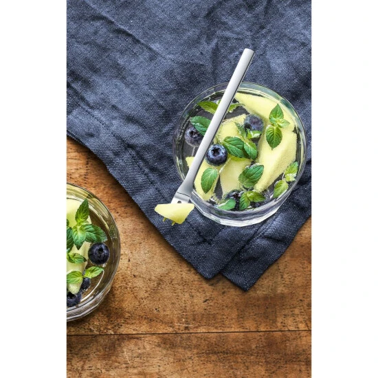 In den 1950er-Jahren das beliebteste Partygetränk, ist Bowle bis heute eigentlich nie aus der Mode gekommen. Serviert wird sie aus einer kugeligen Schüssel (engl. bowl) in ein mittelhohes Glas – dazu wird eine Bowlengabel gereicht. Die grazile Gabel mit zwei Zinken und langem Stiel pickt treffsicher die kleinen Obststückchen aus der Bowle. Im schlichten Design kann sie sich auf jeder Feier sehen lassen und passt zu jeder Art von Bowleglas. Aus Cromargan gefertigt, sind die Gäbelchen rostfrei, formstabil und beständig gegen Speisesäuren, zum Reinigen kommen sie in die Spülmaschine. WMF bietet die 12,5 Zentimeter lange Bowlengabel im 6er-Set in der Besteck-Serie Nuova an.