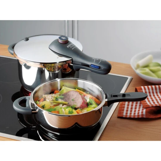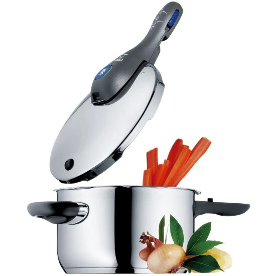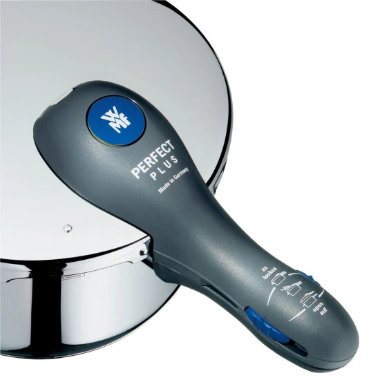 Bei den Schnellkochtöpfen der Kollektion Perfect Plus trifft bewährte Technik auf modernes Design. Die Bedienelemente sitzen am Griff, die Ringe auf dem übersichtlichen Kochsignal geben Auskunft über die Kochstufe und die Restdrucksicherung, und dank des Flammschutzes an Topf- und Seitengriff ist der WMF Perfect Plus auch für den Gebrauch auf dem Gasherd geeignet. Das rostfreie Material Cromargan® schützt die Töpfe vor Stößen und sorgt für eine lange Lebensdauer. Die kinderleichte Bedienung macht die Dampftöpfe, die wegen ihres TransTherm® Allherdbodens auf allen Herdarten zum Einsatz kommen können, zu unkomplizierten Begleitern in der Küche. Auch die Reinigung ist völlig problemlos: Einfach den Griff abnehmen und unter fließendem Wasser abspülen, Deckel und Topf dürfen in die Spülmaschine. Die WMF Perfect Plus Schnelltöpfe sind in fünf Größen und als zweiteilige, stapelbare Sets erhältlich. Die Zubereitung von Speisen im Schnellkochtopf ist modern, schnell und gesund. Durch den extremen Druck und die hohen Temperaturen verkürzen sich herkömmliche Garzeiten um bis zu 70 Prozent bei einer gleichzeitigen Energieeinsparung von circa 50 Prozent. Vitamine, Nähr- und Mineralstoffe bleiben durch das schonende Garen größtenteils erhalten, die Speisen sind nahrhaft und geschmackvoll. Praktisch: Schnelltöpfe eignen sich zum Zubereiten von fast allen Lebensmitteln von Gemüse, Fleisch und Fisch, von Getreide und Hülsenfrüchten, von Suppen und Eintöpfen. Auch Schonkost und Babynahrung gelingen in den Dampftöpfen bestens. Mit seiner einfachen Handhabung und sicheren Technik punktet der Schnelltopf zusätzlich. Kurz: Er ist ein Tausendsassa, auf den Sie nicht verzichten sollten. In 3 Liter Schnellkochtöpfen lassen sich schnell und einfach Beilagen wie Reis oder Kartoffeln zaubern. Auch Gemüse lässt sich vitaminschonend durch die kurze Garzeit zubereiten. Der 3 Liter Schnellkochtopf ist für kleinere Haushalte gedacht, die in kleinen Mengen kochen. Die Essgewohnheiten ändern sich. Oft muss es beim Kochen schnell gehen so wie bei Berufstätigen Familien mit Kindern aber auch in Singlehaushalten. Die meisten Menschen wollen sich trotzdem bewusst ernähren. Wellness ist einer der großen Trends der Gegenwart. Zu beidem passt der WMF Schnelltopf optimal. Denn das Kochen geht schnell und einfach wenn man ein paar Handgriffe beherrscht. Und die gesunden Nährstoffe in den Lebensmitteln bleiben weitgehend erhalten anders als etwa in einer Mikrowelle. Außerdem ist der Schnelltopf sicher und braucht kaum Pflege. Wie alle anderen Schnelltöpfe ist der Schnelltopf Perfect aus unverwüstlichem Cromargan. Den Griff nehmen Sie zum Reinigen einfach ab und halten ihn unter fließendes Wasser. Das Design ist zeitlos klassisch die technische Ausstattung entspricht dem aktuellen Standard.