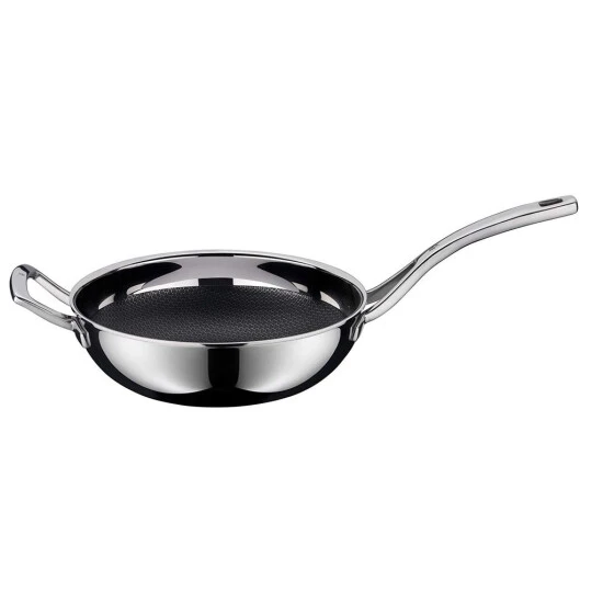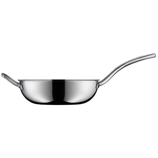 Der WMF Wok Profi Resist Ø 28 cm ist sehr gut geeignet, wenn Sie gerne asiatische Wokgerichte kochen. Der Wok besteht aus verschiedenen Materialien; ein Aluminiumkern, eine Außenseite aus verchromtem Stahl und eine Cromargan-Innenseite mit Beschichtung. Cromargan ist Edelstahl, den WMF 1927 entwickelt und 2009 erneut verbessert hat. Dieses Material besteht aus 18/10 Edelstahl und ist unzerbrechlich, kratzfest und bleibt glänzend. Es sorgt auch für eine schnelle und gleichmäßige Wärmeverteilung und eine präzise Temperaturregelung. Der WMF Wok ist für alle Wärmequellen (einschließlich Induktion) geeignet und kann auch im Ofen verwendet werden.