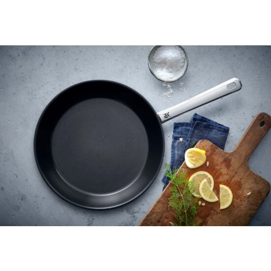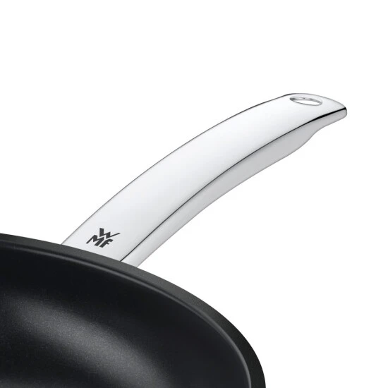 Die WMF SELECTit Stielpfanne mit 24 cm Durchmesser vereint hohe Strapazierfähigkeit mit vielfältigen Einsatzmöglichkeiten und maximalen Komfort beim Braten. Das Multitalent eignet sich für jedes Pfannengericht, ob zum schonenden Garen delikater Fischfilets, oder zum scharfem Anbraten robuster Gemüsesorten und Fleischs. Die hervorragende Antihaftversiegelung lässt dabei nichts anbrennen und erleichtert zudem die Reinigung, während die optimale Wärmeverteilung und -speicherung des TransTherm®-Allherdbodens energiesparendes Braten auf jedem Herd ermöglicht – inklusive Induktion. Gefertigt aus hochwertigem Cromargan®: Edelstahl Rostfrei 18/10 eignet sich die Pfanne auch für Einsätze im Backofen. Dazu verfügt sie über einen wärmereduzierenden* Hohlgriff sowie einen breiten Schüttrand zum tropffreien Ausgießen von Flüssigkeiten.