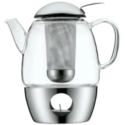 Das WMF SmarTea -Set zeigt einen transparenten, klaren Glaskörper, der Ihnen erlaubt, den Tee visuell zu überwachen. Dieser Glaskörper sitzt auf einem Sockel aus Edelstahl mit einer Öffnung für ein Teelicht, das zum Warmhalten des Tee dient. Das abnehmbare Teesieb ist aus hochwertigem Edelstahl hergestellt und wird einer Gummidichtung beigefügt, die als Siegel dient. Der Deckel ist ebenso aus rostfreiem Stahl. Dieser SmarTea-Satz unterstreicht die hohe Qualität und Funktionalitätsnormen der WMF.