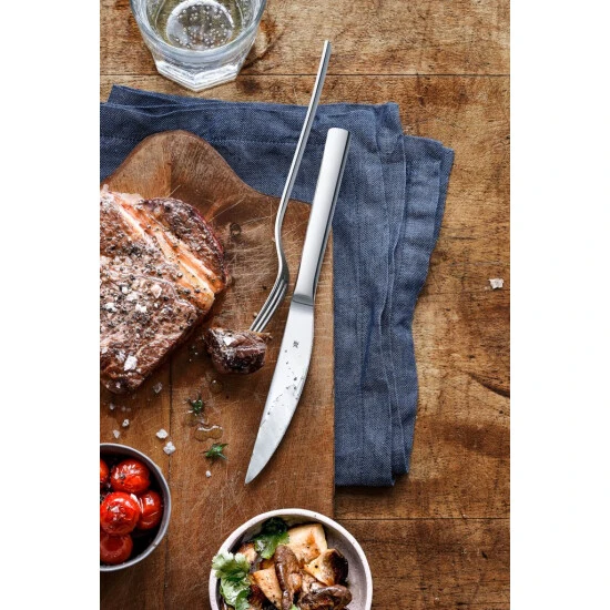 Es schneidet kraftvoll durch Gegrilltes mit krosser Kruste, gleitet geschmeidig auch durch dickes Fleisch. Die Steakbesteck-Gabel hat extralange und spitze Zinken, um die Fleischstücke aufzuspießen. Mit der Außenkante lassen sich Folienkartoffeln und Gemüse leicht zerteilen. WMF bietet Steakbesteck in zwei Kollektionen an: In der Serie Nuova sind Messer und Gabel durchgehend aus Cromargan® gefertigt, spülmaschinenfest, als Paar oder 12-teiliges Set zu haben.