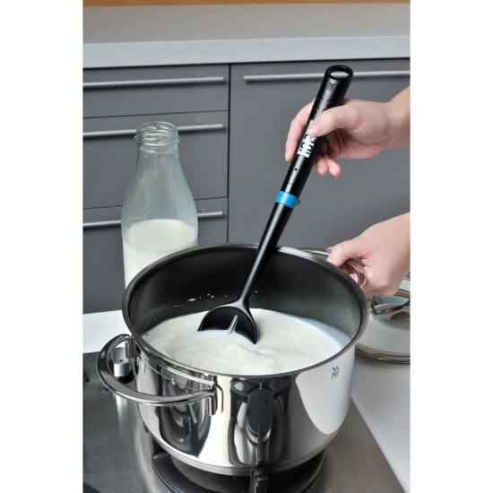 - Der Kochlöffel mit Thermometer kann während dem Rühren die Temperatur messen und gibt ein Signal, wenn die voreingestellte Temperatur erreicht ist