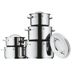 Alles gut im Griff hat man mit der Kochtopf-Serie ‘Gala Plus’ von WMF. Der Aufliegedeckel lässt sich schnell zur Seite schieben durch seine flache Form ist er einfach in die Spülmaschine einzuordnen. Der TransTherm-Allherdboden sorgt für eine gleichmäßige und schnelle Wärmeverteilung. Das Material ist unverwüstlich stabil geschmacksneutral und hygienisch. Die Serie verbindet modernes Design mit besten Kocheigenschaften. Induktionsgeeignet.