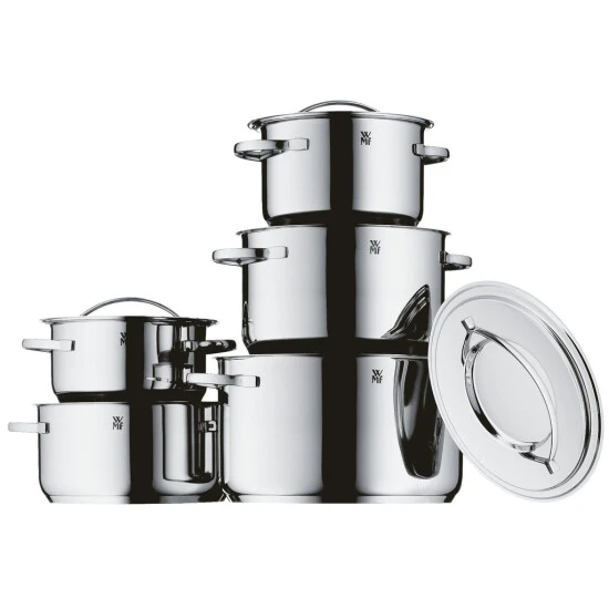 Qualität für deine Küche. Ob schnelles Mittagessen oder aufwändiges Dinner mit der ganzen Familie – mit dem 5-teiligen Topfset Gala Plus von WMF bist du in der Küche für (fast) alle Eventualitäten bestens ausgestattet. Das Set besteht aus 2 Bratentöpfen (Ø 16 und 20 cm) und 3 Fleischtöpfen (Ø 16, 20 und 24 cm) mit passenden Deckeln. Die größeren Töpfe eignen sich besonders gut, um darin Pasta oder Schmorfleisch zuzubereiten. Die kleineren Töpfe kannst du für leckere Beilagen oder aromatische Saucen nutzen. Besonders praktisch: Die Töpfe sind mit breitem Schüttrand ausgestattet. So lassen sich Flüssigkeiten kleckerfrei ausgießen und dosieren. Alle Bestandteile des Sets sind aus poliertem Cromargan® Edelstahl Rostfrei 18/10 gefertigt. Das Material setzt sich aus 18 % Chrom, 10 % Nickel und 72 % Stahl zusammen. Es ist formstabil, unempfindlich gegen Speisesäuren sowie geruchs- und geschmacksneutral. Der Geschmack deiner Zutaten wird also nicht durch Fremdaromen verfälscht. Der TransTherm®-Allherdboden sorgt für eine gleichmäßige Wärmeverteilung und –speicherung und erlaubt den Einsatz auf allen Herdarten, inklusive Induktion. Die kurzen Profilgriffe sind fest mit Töpfen und Deckeln verschweißt, sodass du die Töpfe bequem halten und transportieren kannst. Das Set lässt sich nach Gebrauch einfach in der Spülmaschine reinigen.