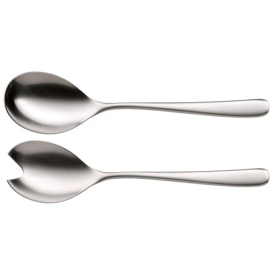 Durchmischen, aufgreifen, servieren: Keine Frage, zu einem frischen Salat gehört ein Salatbesteck. Es ist stets zweiteilig, wobei seine flachen, äußerst großzügig gestalteten Laffen die leichte Aufnahme des Salats ermöglichen – und zwar so, dass überschüssiges Dressing vor dem Servieren leicht abtropfen kann. Die langen Stiele des Bestecks sorgen für bequemes Hantieren und verhindern zugleich, dass es in die Salatschlüssel rutscht.