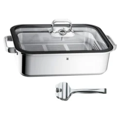 - Inhalt: 1x Schmortopf/Bräter (41 x 27 x 10 cm, V 6,5l), 1x Garblech (31 x 23 x 6,5 cm), 2x Drahtgriffe, 1x Glasdeckel mit Silikondichtung mit herausnehmbaren Thermometer, 1x Zange – Artikelnummer: 1741036049